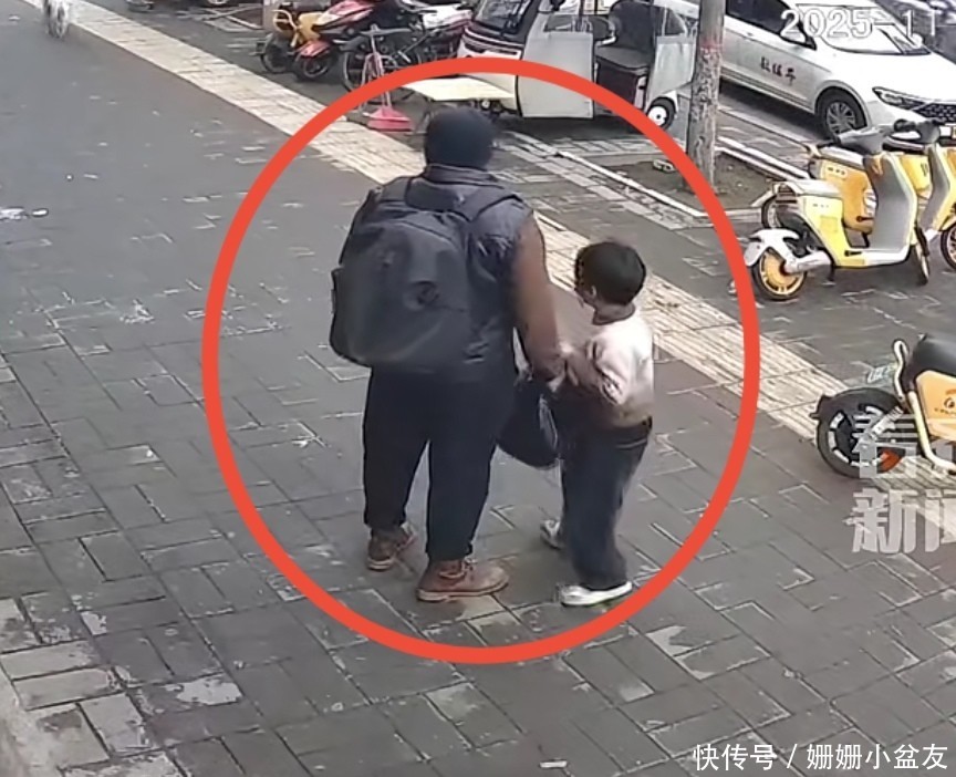 幸好,在这万分危险的时刻,男孩儿的爸爸听到哭声后,飞快地从马路对面跑了过来,一边吆喝着一边驱赶。